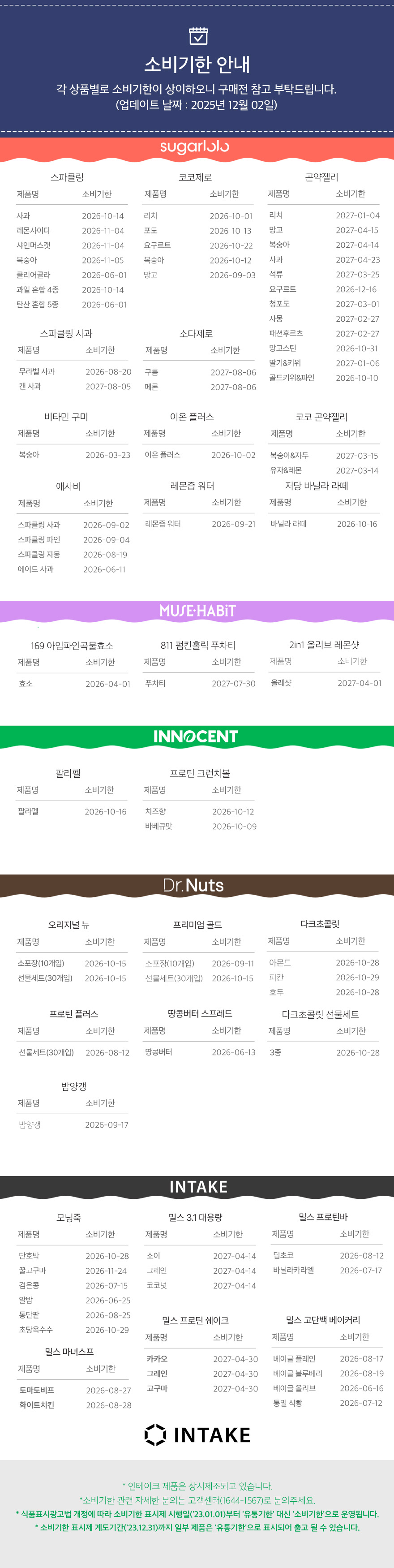 공지 ☆인테이크 상품별 소비기한 안내 (매월 업데이트)